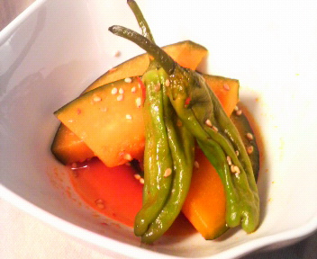 南瓜と獅子唐のピリ辛煮、これは旨い!酒のつまみにも最適な一品。