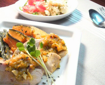 ☆蒸し鶏 南瓜と玉葱のソースを添えて