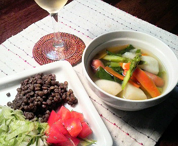 野菜スープは冷蔵庫に半端に残っている物を適当にぶちこんだだけです。