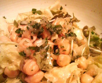 夜はひよこ豆入りのグリーンサラダ、チーズに赤ワイン。