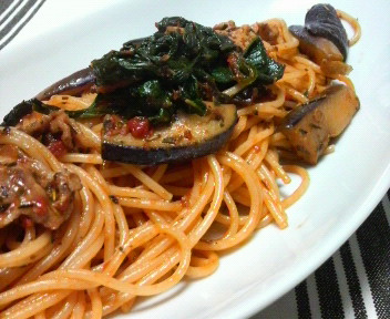 ☆豚バラと茄子、ほうれん草のアンチョビトマトパスタ