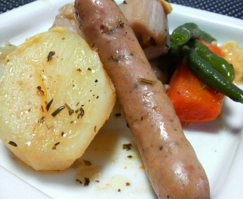 冷蔵庫の余り野菜を蒸し煮にして遅めの昼ごはんです。