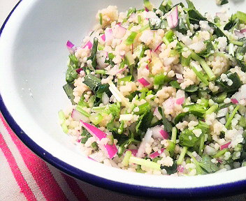 昨日の残りのクスクスに、三つ葉・水菜・紫玉葱の微塵切りを混ぜて