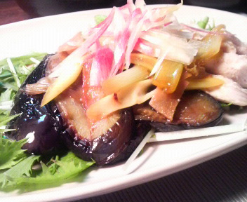 胡麻油で炒めた茄子にめんつゆ&酒、生姜、長葱を加えてくたくたに煮ます。