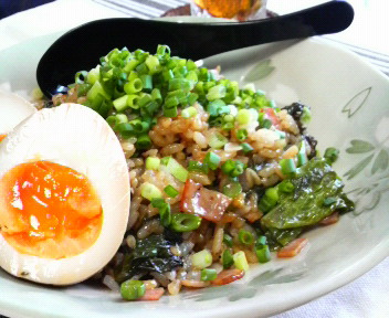 薬味にあさつきと大葉をたっぷり。1人だから、卵も一個丸々食べちゃいます!