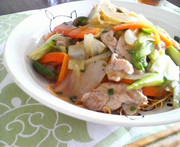 今日の具は、人参・ピーマン・アスパラ・玉葱・キャベツ・豚肉。