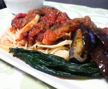 茄子としめじは別に炒め、ほうれん草も茹でておいたのを添えて。