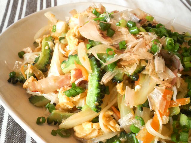 ゴーヤ、玉ねぎ、人参、厚切りベーコン、卵入りです。