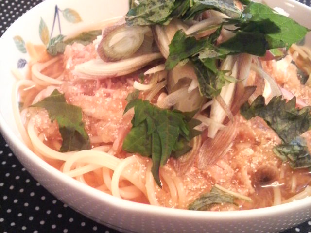固めにゆでて水でしめた素麺は、一番最後に入れるのがいいと思います。