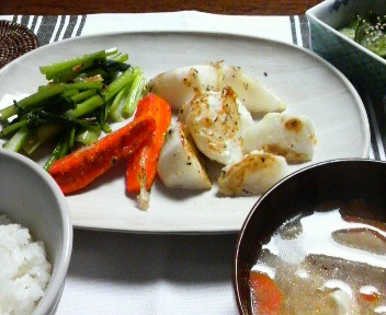 胡麻油で炒めつつ、軽く焼き目をつけ、お酒と醤油で味付け。