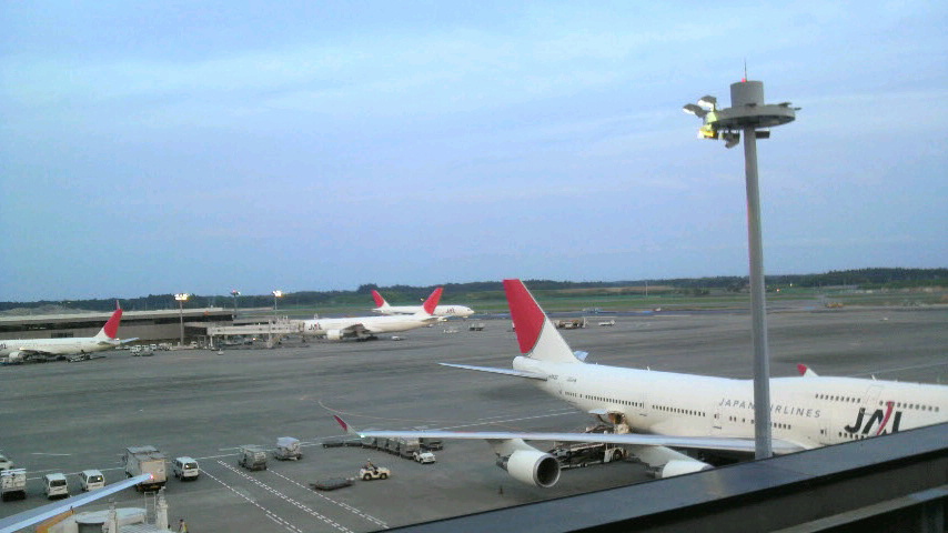 今朝三時半に飛行機に乗って、四時頃サンドイッチを与えられ七時半に成田着。
