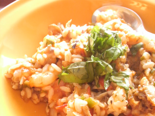 玉葱、ピーマン、トマトに冷凍シーフードミックスでリゾット。