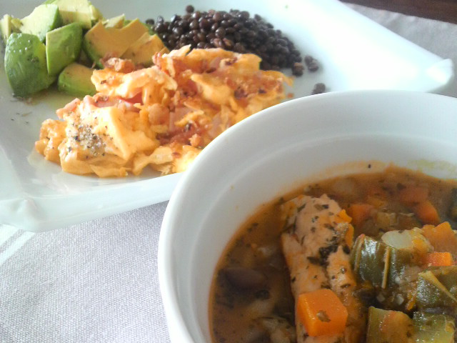 昨夜の残りのラタトゥイユ風野菜たっぷりスープ、レンズ豆。