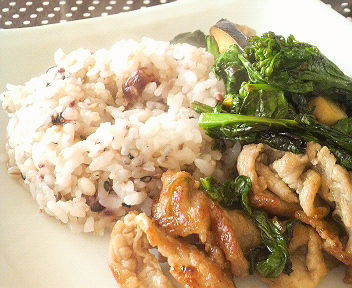 ランチは死にそうな豚肉と菜の花を使い切るべく、茄子も加えて炒めもの。