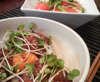 甘辛ソースにして、生卵を真ん中に落とし、胡麻と貝割れをたくさん。