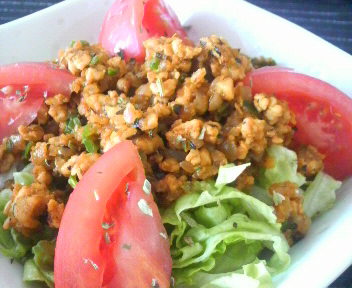 鶏挽き肉、玉葱、ピーマンを一緒に炒めて、スパイス&ハーブてんこ盛り、