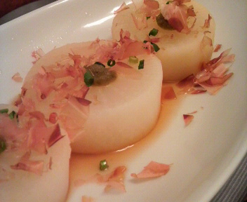 柔らかく下茹でした大根に酒を振り、めんつゆ少々、柚子胡椒を