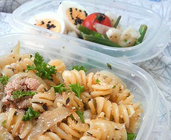 そんな訳でお弁当は控えめに、フジッリのたらこバジル炒め、