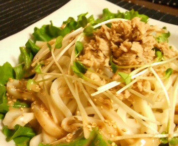 グリーンリーフにツナ、貝割れ、たれは胡麻しゃぶのたれをめんつゆで伸ばしたもの。