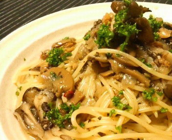 にんにく・鷹の爪、舞茸をオリーブオイルで炒めたら、