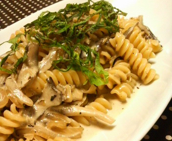 舞茸と玉葱をオリーブオイルで炒めたら、生クリームと低脂肪乳少々を加え、